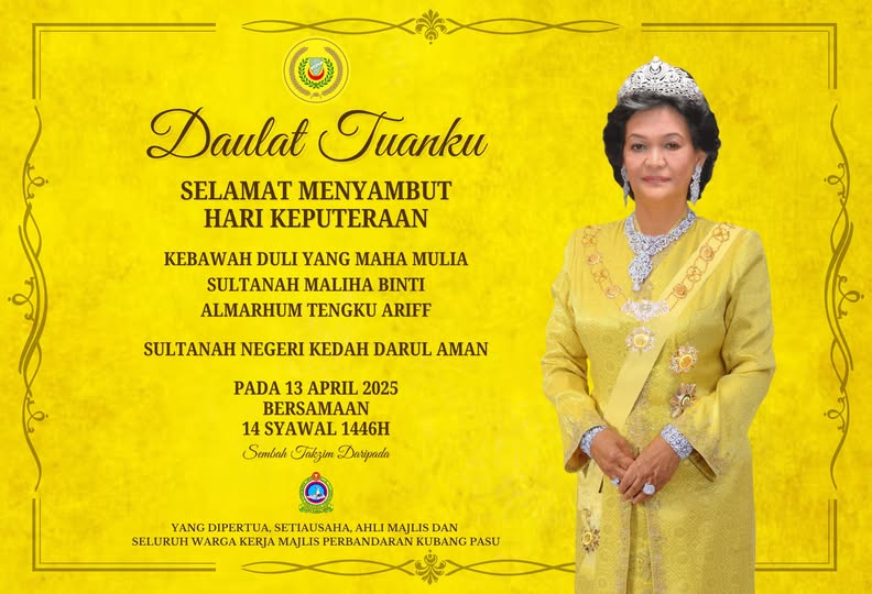 Kebawah Duli Yang Maha Mulia Sultanah Maliha binti Almarhum Tengku Ariff, Sultanah Negeri Kedah Darul Aman pada 13 April 2025 bersamaan 14 Syawal 1446H.