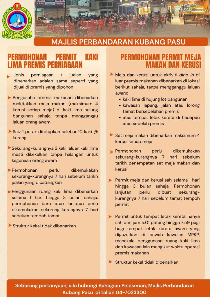 Majlis Perbandaran Kubang Pasu (MPKP) memaklumkan bahawa permohonan permit penggunaan kaki lima premis perniagaan serta permit meja makan dan kerusi bagi premis makanan adalah tertakluk kepada syarat-syarat tertentu yang telah ditetapkan.