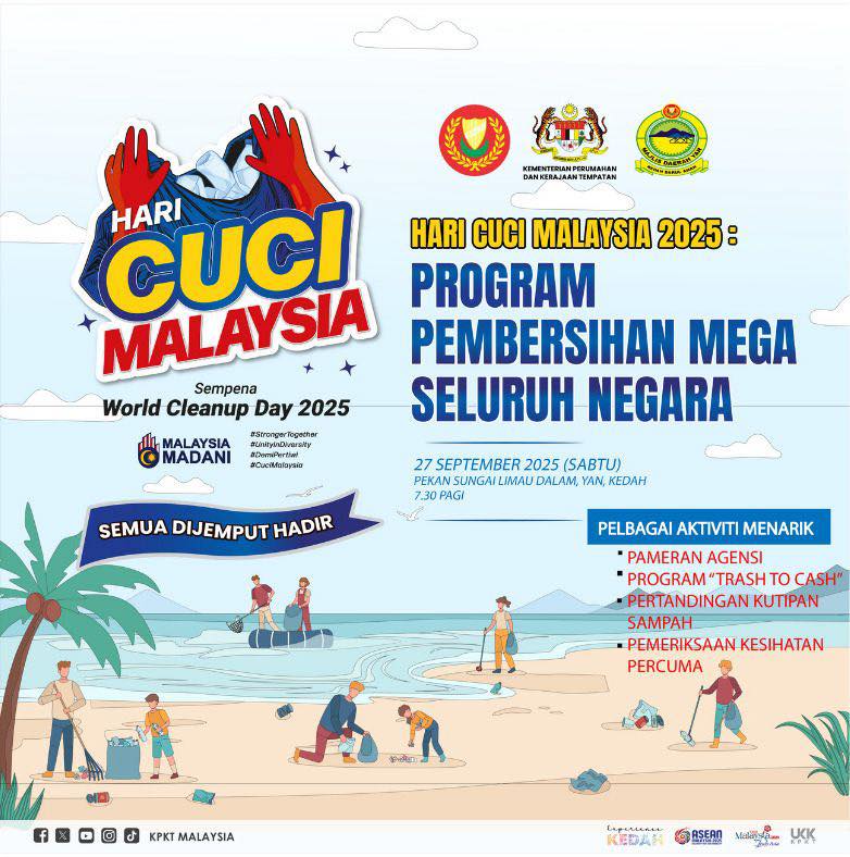 Orang ramai dijemput hadir beramai-ramai ke Gotong-Royong Hari Cuci Malaysia Peringkat Negeri Kedah 2025 pada: