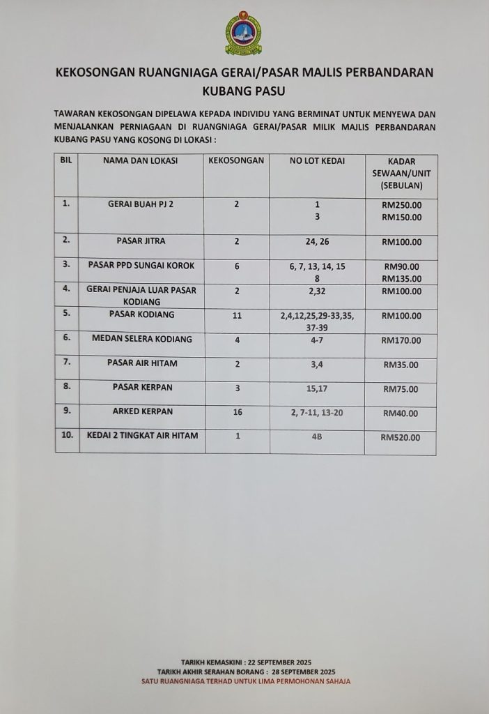 Tawaran Kekosongan Dipelawa Kepada Individu Yang Berminat Untuk Menyewa Dan Menjalankan Perniagaan Di Ruang Niaga Gerai/Pasar Milik Majlis Perbandaran Kubang Pasu Yang Kosong.