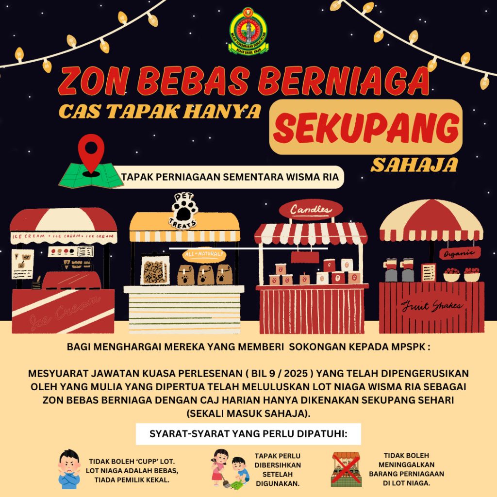Majlis Perbandaran Sungai Petani Kedah (MPSPK) sentiasa menghargai para peniaga kecil yang menjadi nadi ekonomi tempatan. Demi menyokong kelangsungan perniagaan rakyat, MPSPK menawarkan caj lot niaga hanya SEKUPANG (RM0.10) sahaja.