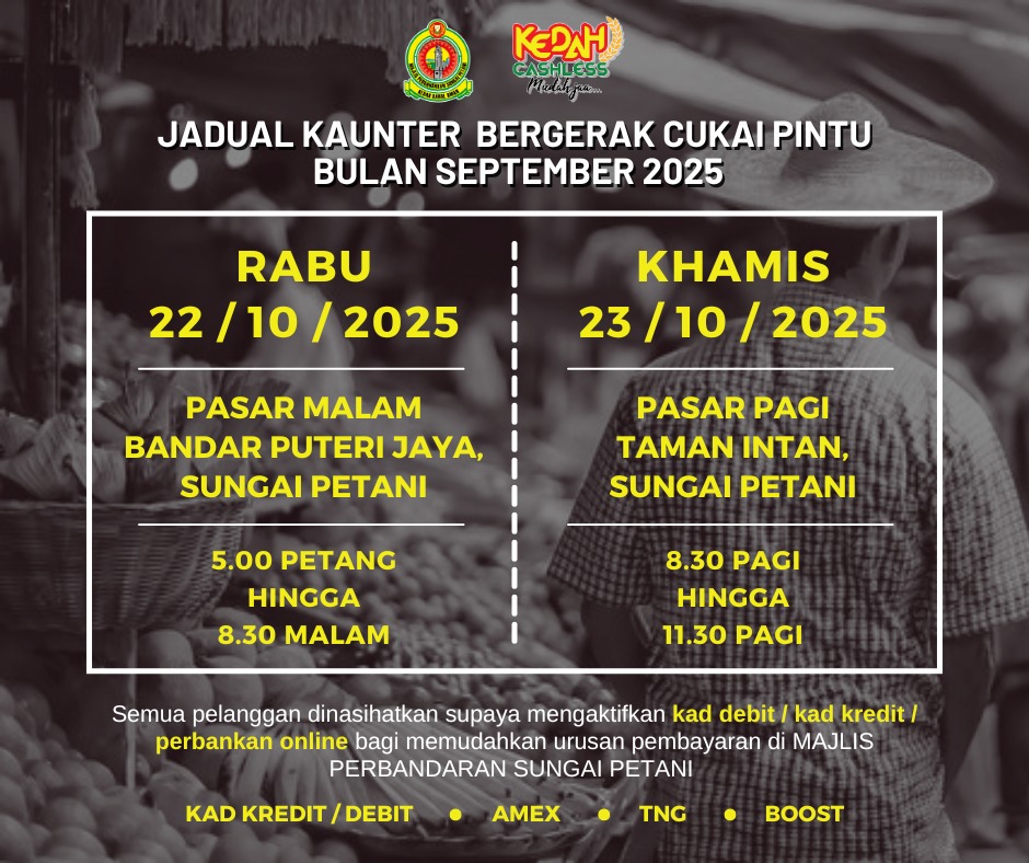 Majlis Perbandaran Sungai Petani (MPSPK) akan menyediakan 𝐊𝐚𝐮𝐧𝐭𝐞𝐫 𝐁𝐞𝐫𝐠𝐞𝐫𝐚𝐤 𝐂𝐮𝐤𝐚𝐢 𝐏𝐢𝐧𝐭𝐮 𝐁𝐮𝐥𝐚𝐧 Oktober 𝟐𝟎𝟐𝟓.Inisiatif ini bertujuan untuk memudahkan urusan pembayaran cukai pintu oleh penduduk setempat, disamping mendekati penduduk di kawasan sekitar.