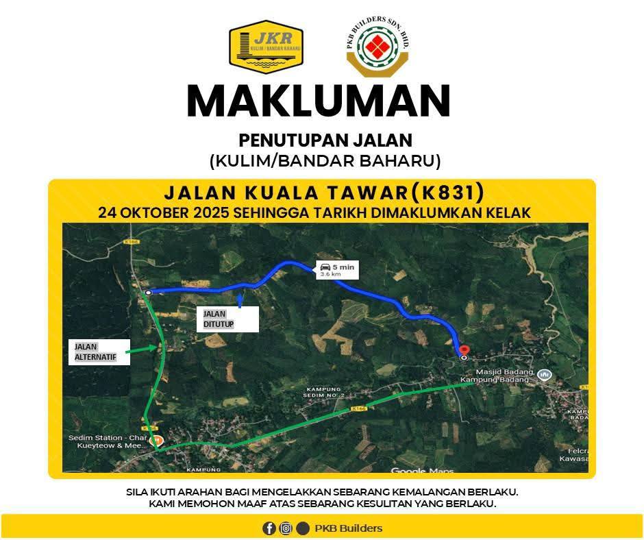 Dimaklumkan bahawa Jalan K831 (Jalan Kuala Tawar) ditutup sepenuhnya kepada semua kenderaan sehingga tarikh yang akan dimaklumkan kelak berikutan berlakunya pergerakan aktif tanah di lokasi kejadian.