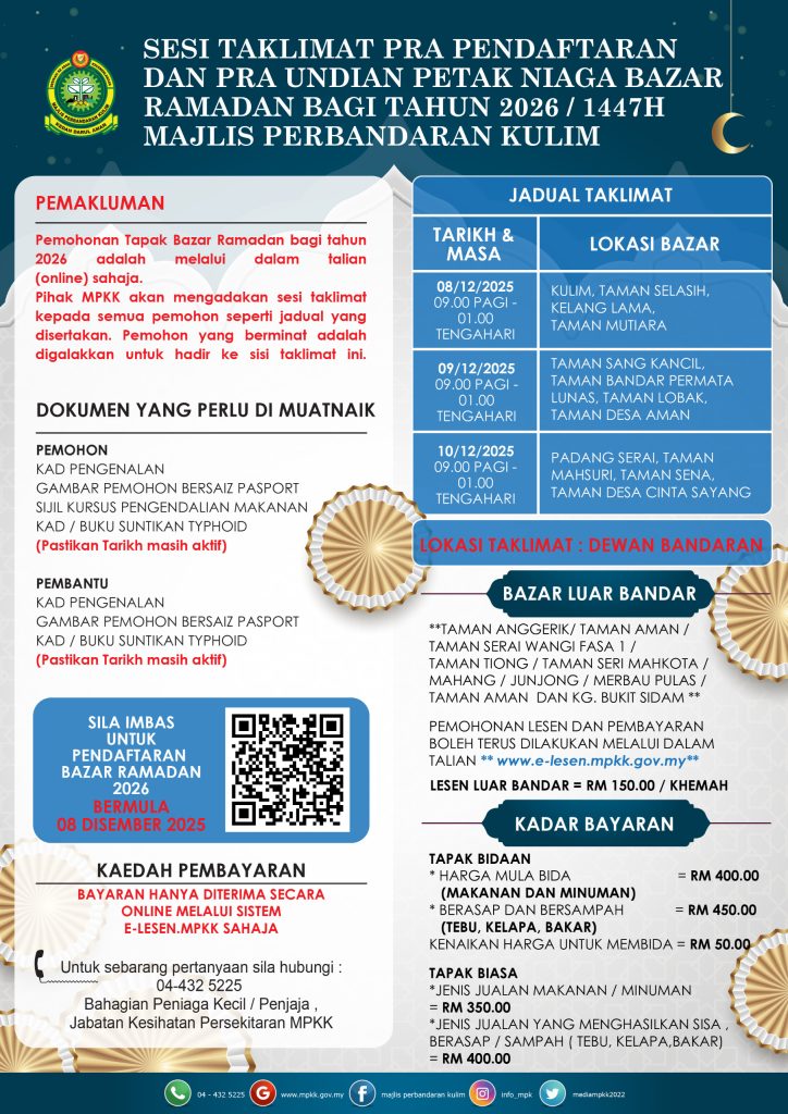 Permohonan tapak Bazar Ramadan bagi tahun 2026 akan dilaksanakan secara dalam talian (online) sahaja dan dibuka mulai 8 Disember 2025.