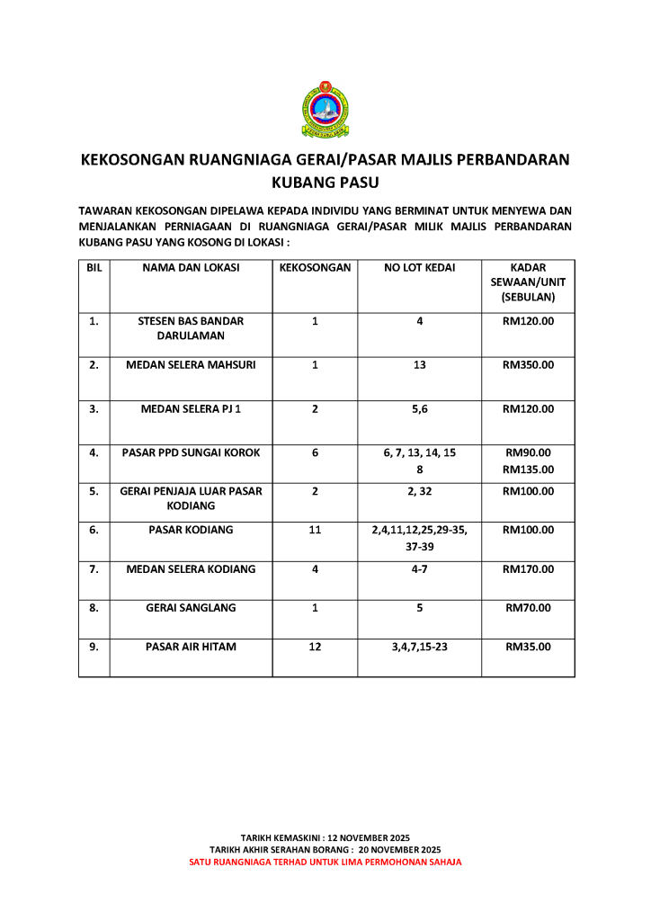 TAWARAN KEKOSONGAN DIPELAWA KEPADA INDIVIDU YANG BERMINAT UNTUK MENYEWA DAN MENJALANKAN PERNIAGAAN DI RUANGNIAGA GERAI/PASAR MILIK MAJLIS PERBANDARAN KUBANG PASU.