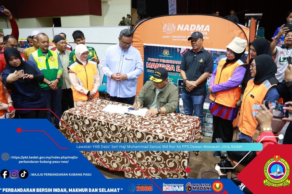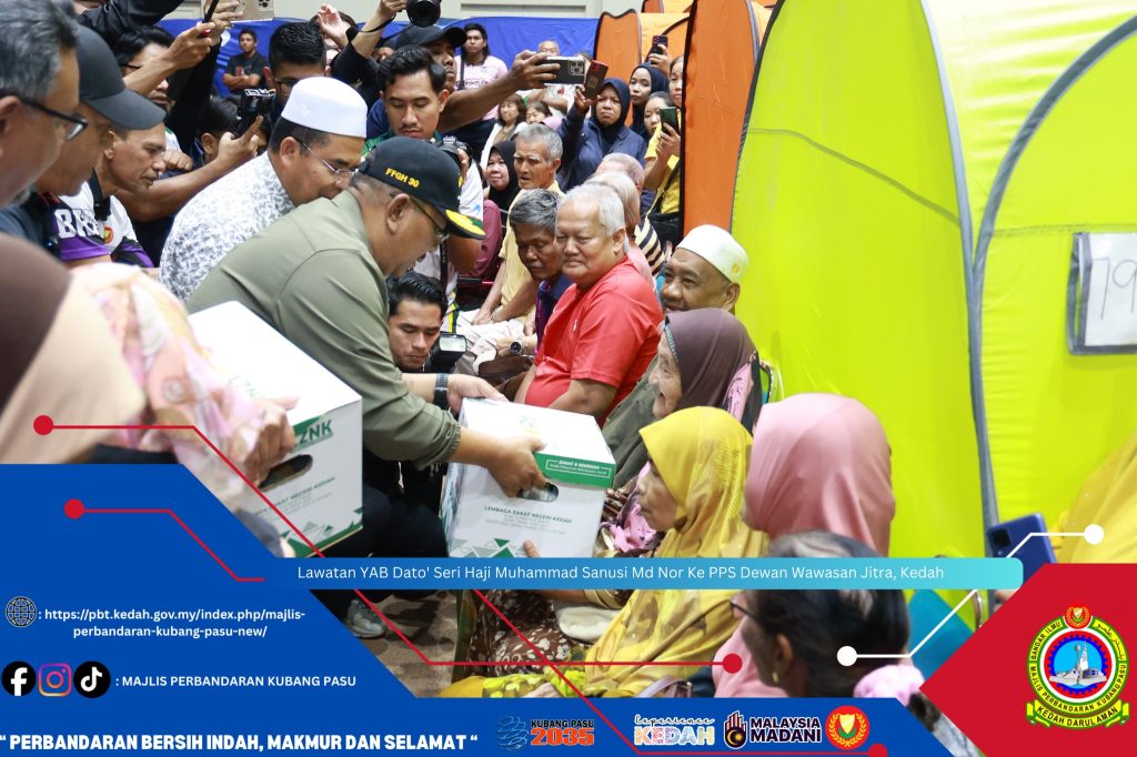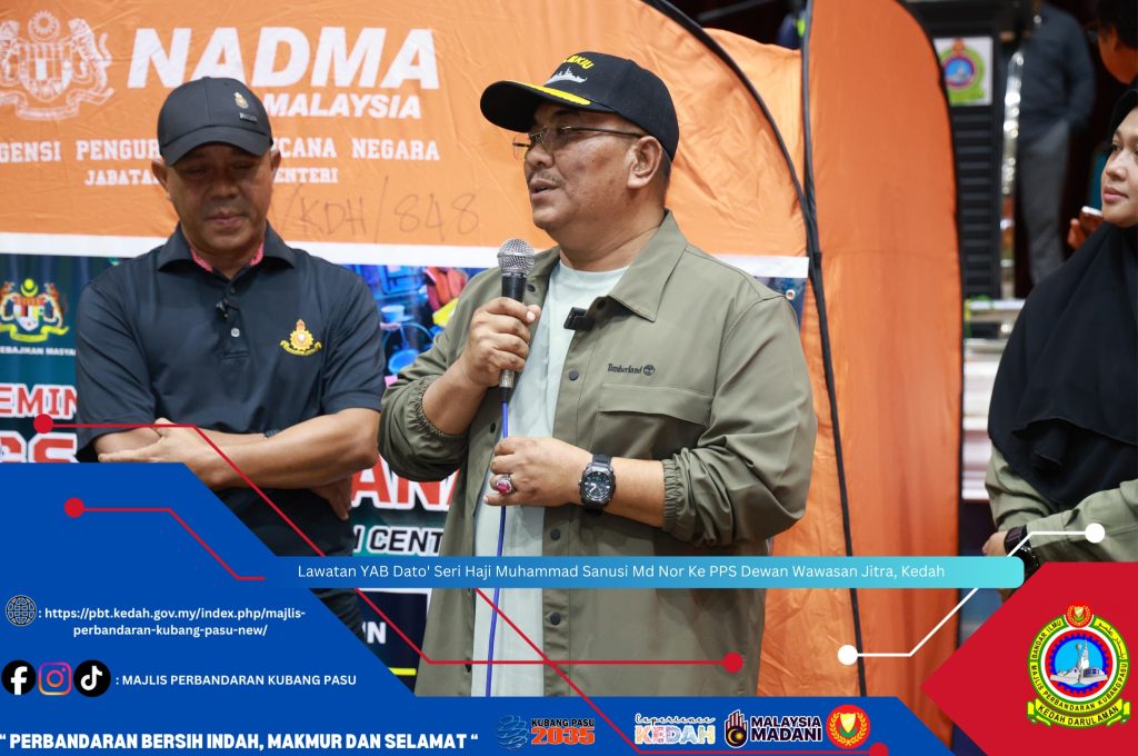 Jitra, 28 November 2025 (Jumaat) – Yang Amat Berhormat Dato’ Seri Haji Muhammad Sanusi Md Nor, Menteri Besar Kedah, telah mengadakan lawatan ke Pusat Pemindahan Sementara (PPS) Dewan Wawasan Jitra di Kedah. Kunjungan ini bertujuan untuk meninjau keadaan mangsa-mangsa yang terjejas dan berlindung di PPS tersebut serta melihat secara langsung operasi pengurusan bantuan yang dikendalikan oleh pelbagai agensi, termasuk Majlis Perbandaran Kubang Pasu (MPKP) dan Agensi Pengurusan Bencana Negara (NADMA). Lawatan ini turut memperlihatkan YAB Menteri Besar beramah mesra dengan para petugas dan sukarelawan, memberikan kata-kata semangat, dan mendengar keluhan serta keperluan yang dihadapi oleh mangsa-mangsa banjir.