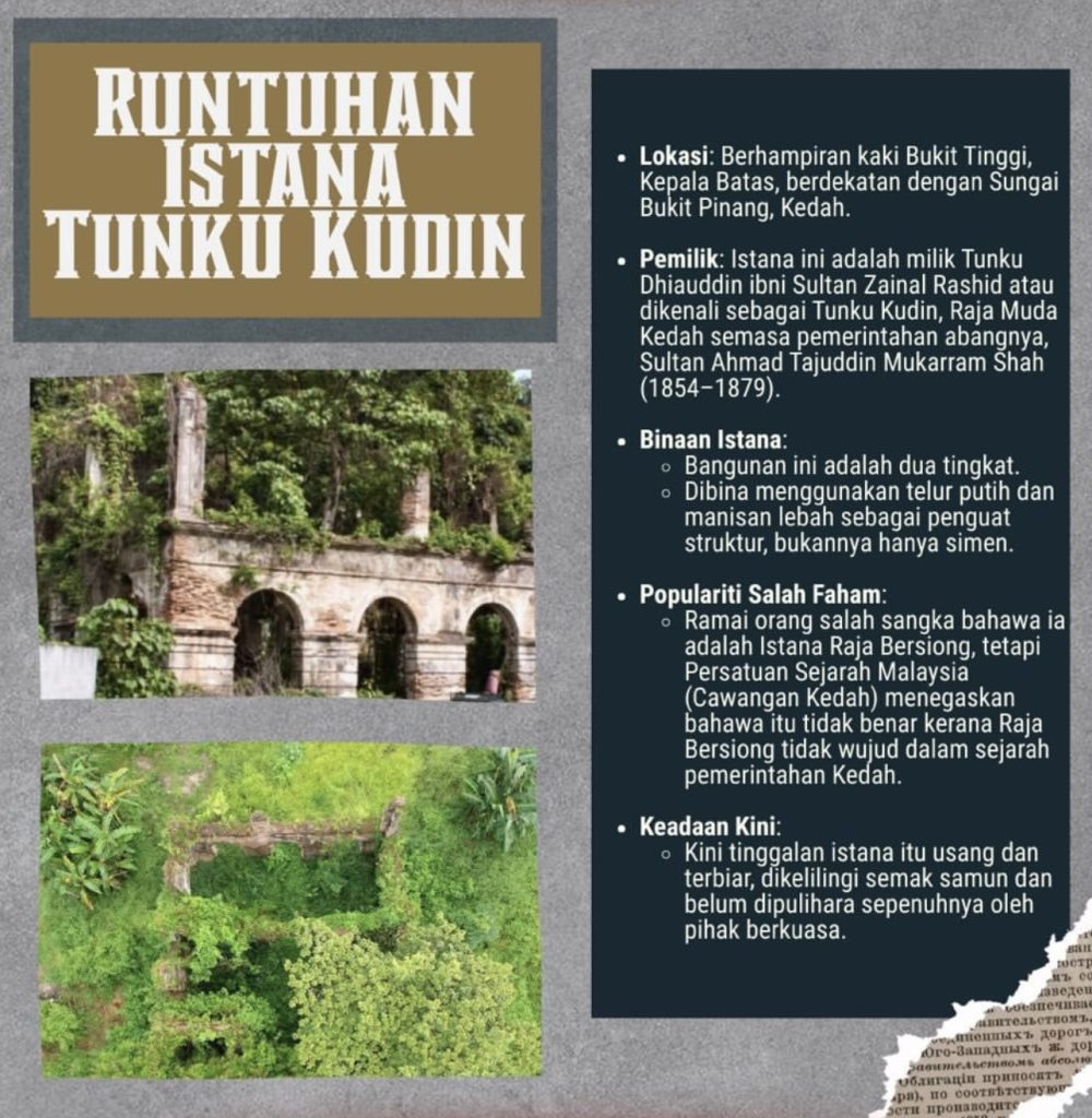 KEPALA BATAS – Terletak hanya 1.6km dari pekan Kepala Batas dan berhampiran nadi pengangkutan silam iaitu Sungai Bukit Pinang, berdiri teguh sebuah istana dua tingkat milik Tunku Dhiauddin atau Tunku Kudin yang kini kian terpinggir. Dibina selepas era Perang Saudara Selangor sekitar abad ke-19, istana ini menampilkan keunikan seni bina luar biasa apabila menggunakan campuran putih telur dan manisan lebah sebagai ejen pengukuh struktur bagi menggantikan simen. Meskipun lokasinya strategik berdekatan Lapangan Terbang Sultan Abdul Halim, monumen berusia lebih seabad ini terus dibiarkan merana tanpa pemuliharaan menyeluruh, sekali gus menyaksikan khazanah sejarah yang tinggi nilainya ini semakin dimakan usia.