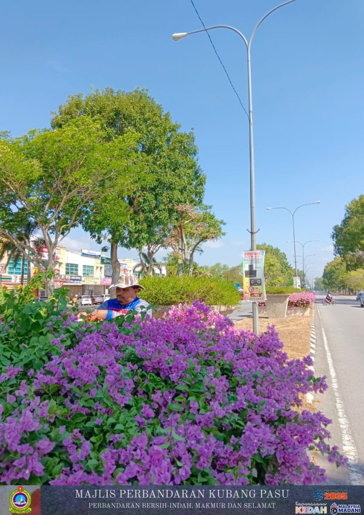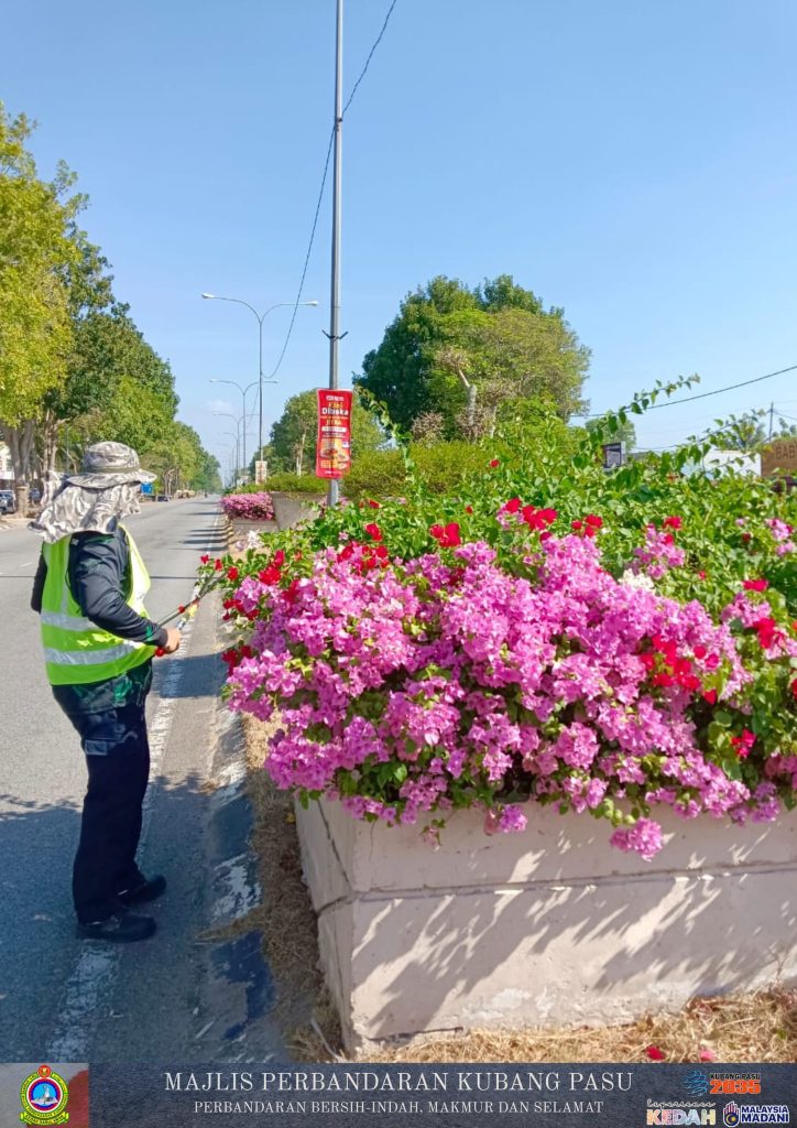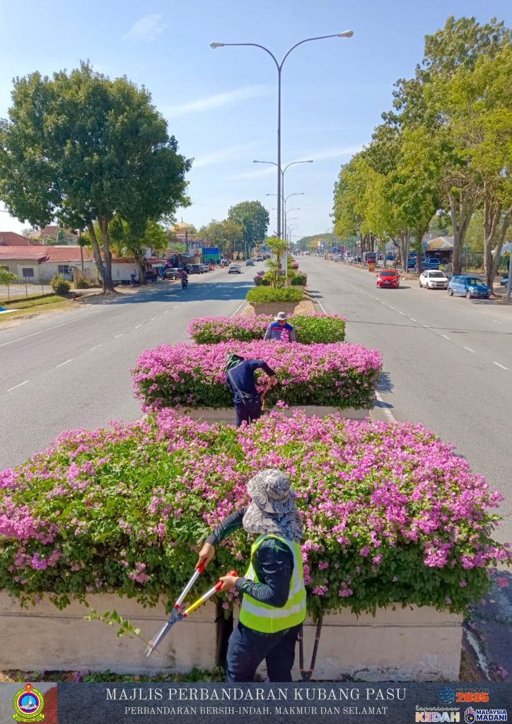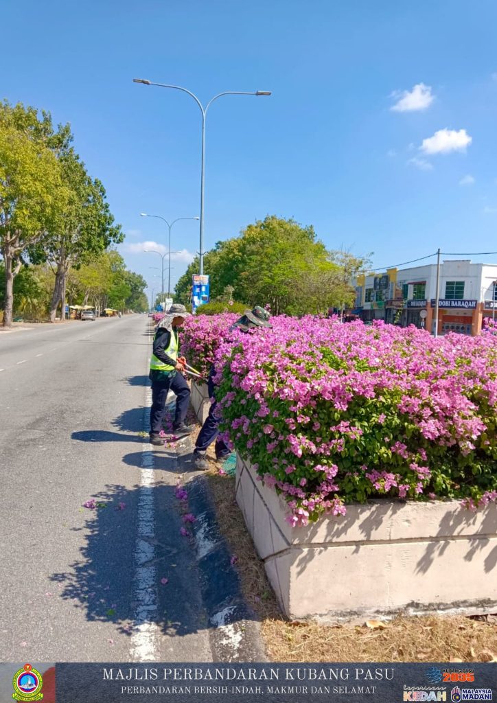 Jabatan Pembangunan Landskap Majlis Perbandaran Kubang Pasu (MPKP) kini giat menjalankan kerja-kerja penyelenggaraan landskap di sepanjang Jalan Jitra-Kepala Batas, berhampiran kawasan Tok Jalai. Melalui pemantauan gambar tersebut, para petugas dilihat memberikan tumpuan sepenuhnya kepada aktiviti pemangkasan pokok bunga kertas (Bougainvillea) yang menghiasi pembahagi jalan. Proses pemangkasan ini bukan sahaja bertujuan untuk memastikan tanaman sentiasa dalam keadaan kemas dan terkawal, malah ia penting bagi merangsang pertumbuhan bunga yang lebih lebat, sekali gus menaikkan seri estetika laluan utama tersebut buat para pengguna jalan raya.