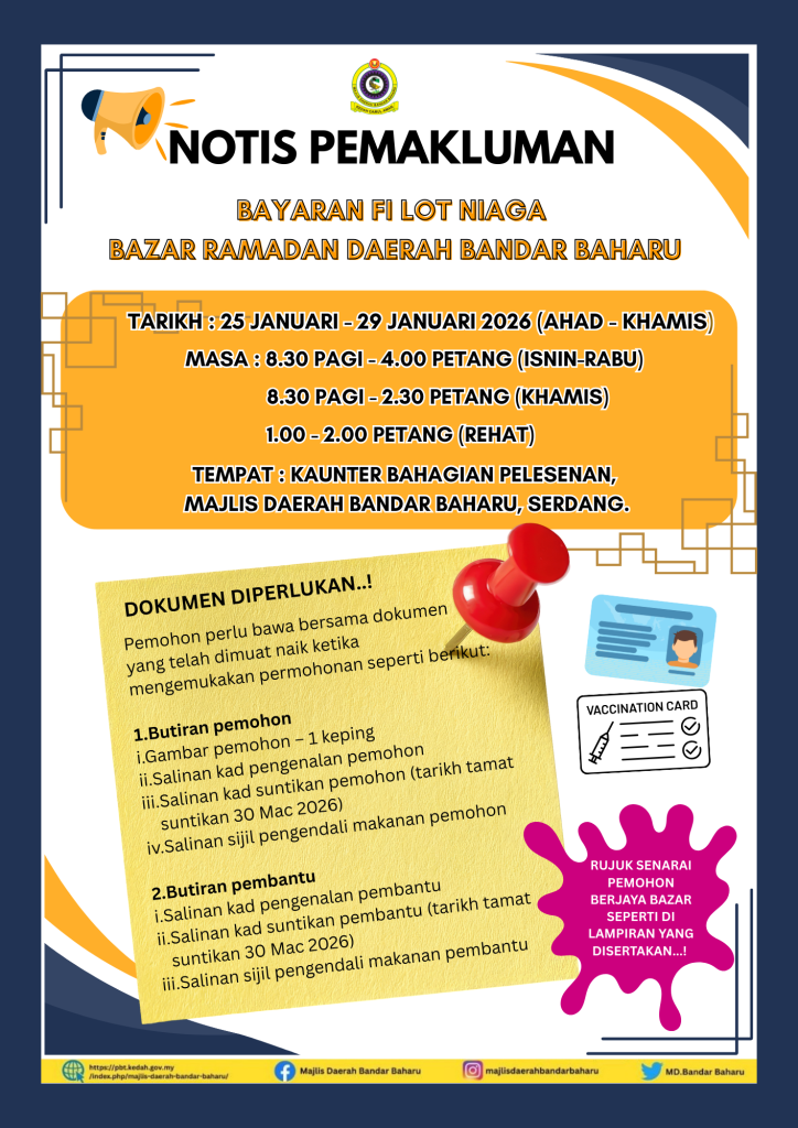 Sila lihat dan muat turun senarai pemohon berjaya Bazar Ramadan Daerah Bandar Baharu 2026. Klik di sini.