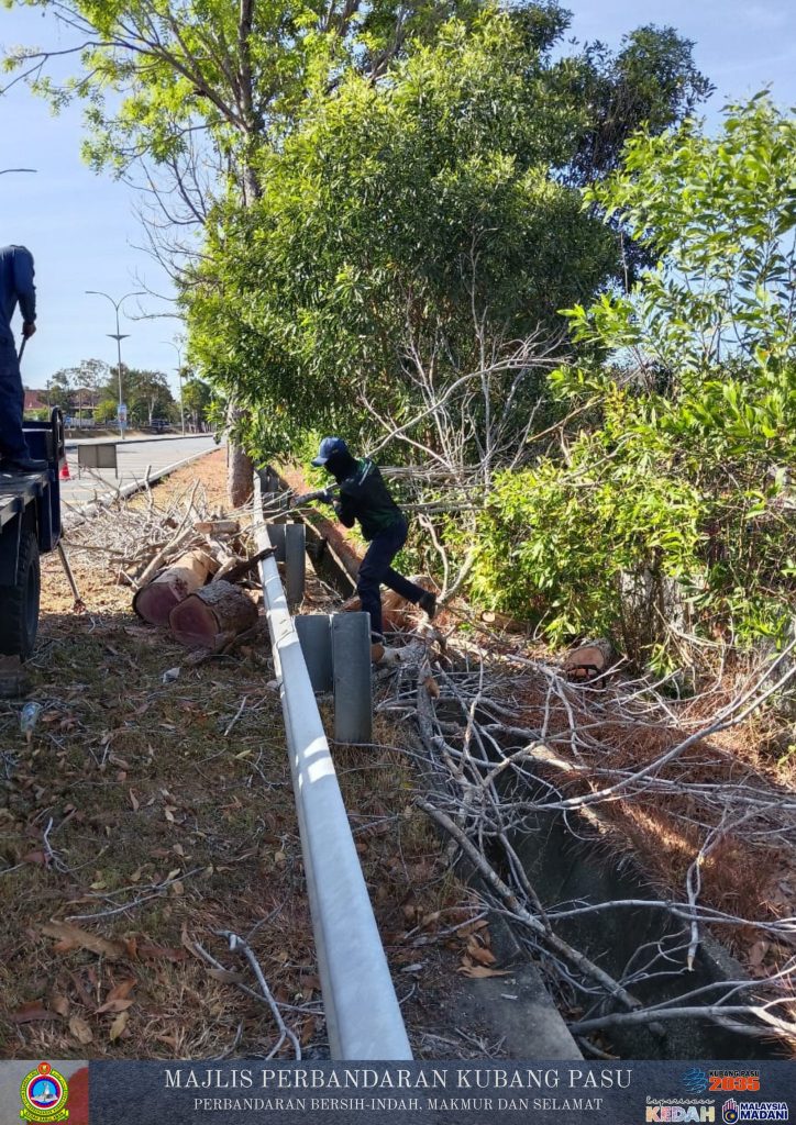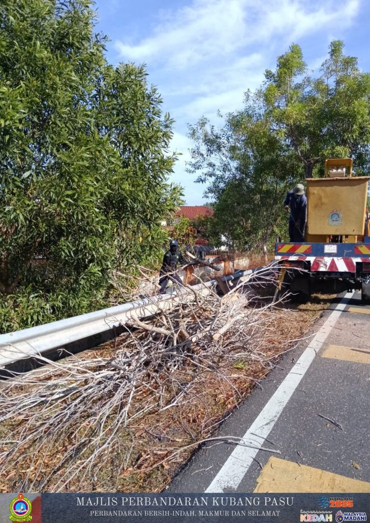 JITRA – Jabatan Pembangunan Landskap, Majlis Perbandaran Kubang Pasu (MPKP) telah melaksanakan operasi penyelenggaraan landskap yang melibatkan kerja-kerja pemangkasan dan pemotongan pokok di sepanjang bahu jalan utama. Menggunakan jentera skylift, pasukan teknikal melakukan proses trimming terhadap dahan-dahan yang lebat serta memotong pokok-pokok yang telah mati bagi memastikan penglihatan pemandu tidak terhalang dan mengurangkan risiko pokok tumbang.