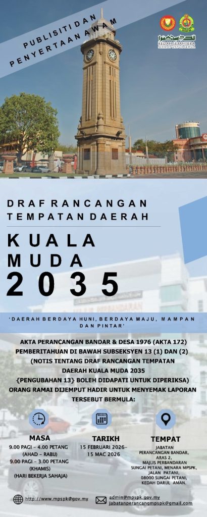 Majlis Perbandaran Sungai Petani Kedah (MPSPK) menjemput orang ramai untuk meneliti Draf Rancangan Tempatan Daerah Kuala Muda 2035 (Pengubahan 13) yang kini dibuka untuk pemeriksaan awam. Rancangan ini mengandungi pelbagai cadangan dan hala tuju Pembangunan di seluruh daerah.