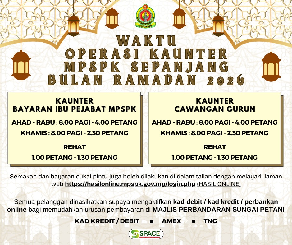 Sempena kedatangan bulan Ramadan yang penuh keberkatan, Majlis Perbandaran Sungai Petani Kedah (MPSPK) memaklumkan waktu operasi kaunter bagi memudahkan urusan orang ramai adalah seperti berikut: