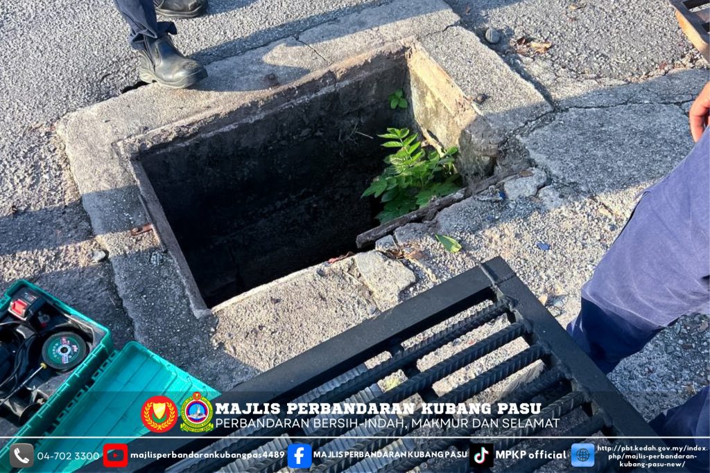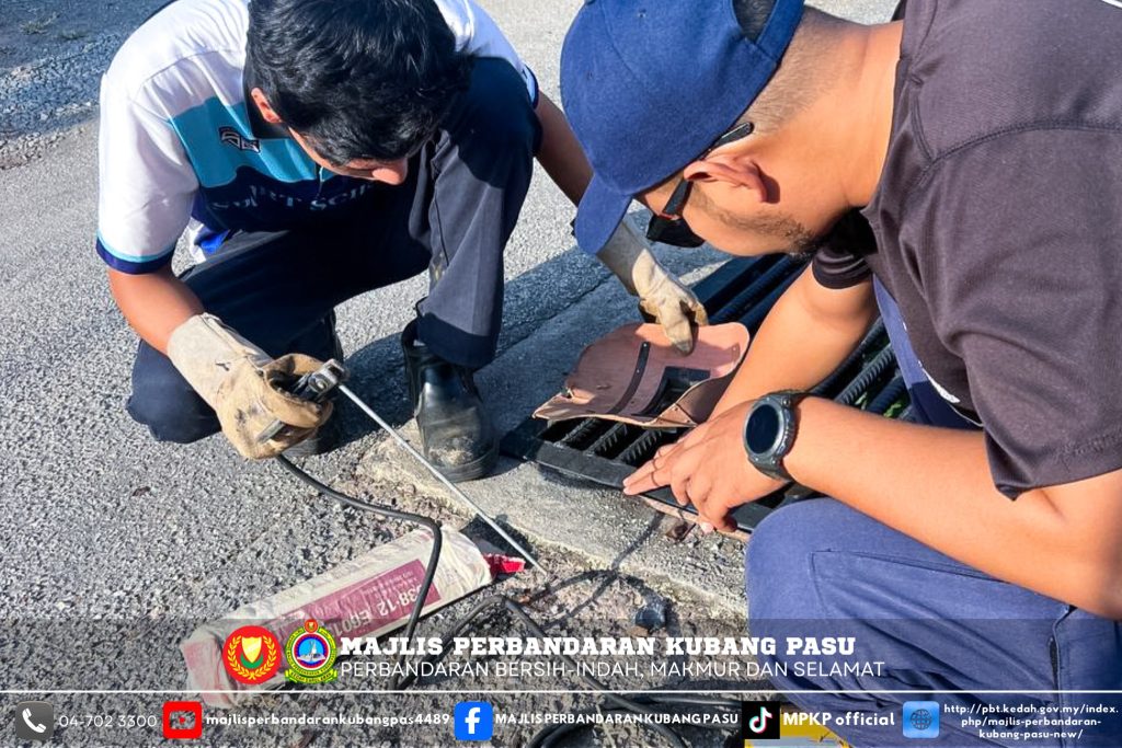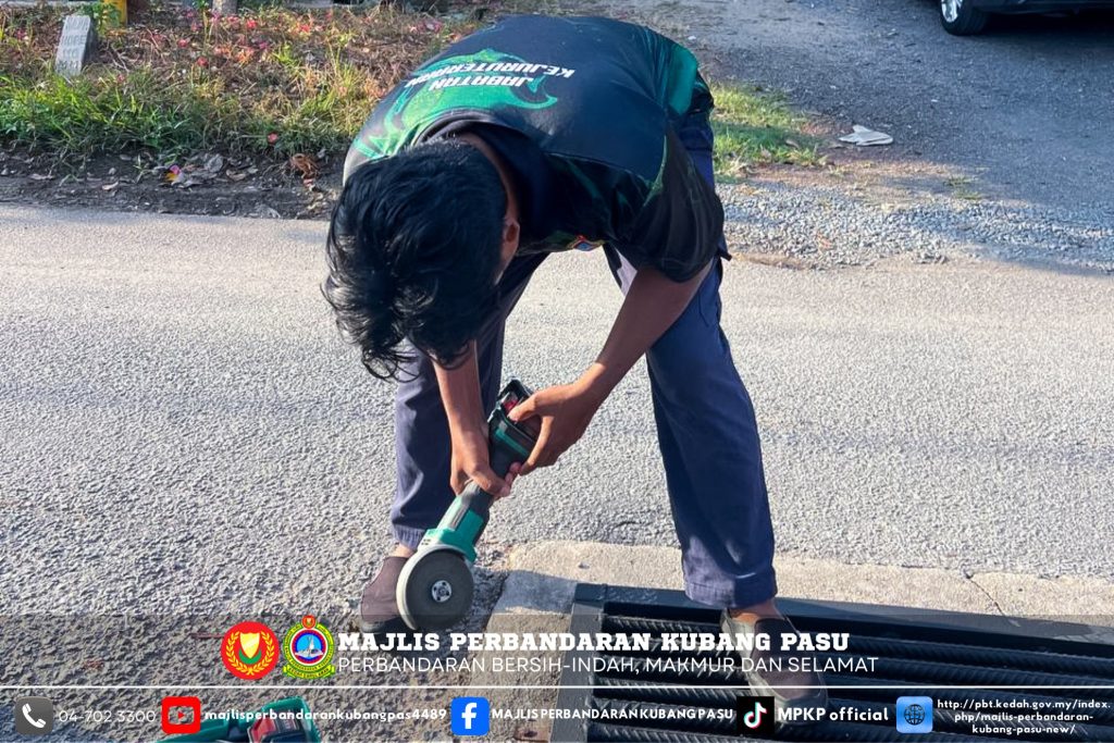 Jitra, 3 Mac 2026 (Selasa) – Majlis Perbandaran Kubang Pasu (MPKP) melalui pasukan teknikalnya telah menjalankan kerja-kerja penyelenggaraan dan pemasangan semula jeriji besi longkang yang rosak demi menjamin keselamatan orang awam di kawasan pentadbiran mereka. Proses penyelenggaraan ini melibatkan kerja-kerja pemotongan besi menggunakan mesin pencanai, penyelarasan kedudukan jeriji pada lubang longkang, serta kerja kimpalan (welding) bagi memastikan struktur besi tersebut kukuh dan tidak mudah beralih. Inisiatif ini merupakan sebahagian daripada komitmen berterusan pihak berkuasa tempatan dalam menyelenggara fasiliti awam bagi mewujudkan perbandaran yang bersih, indah, makmur, dan selamat.