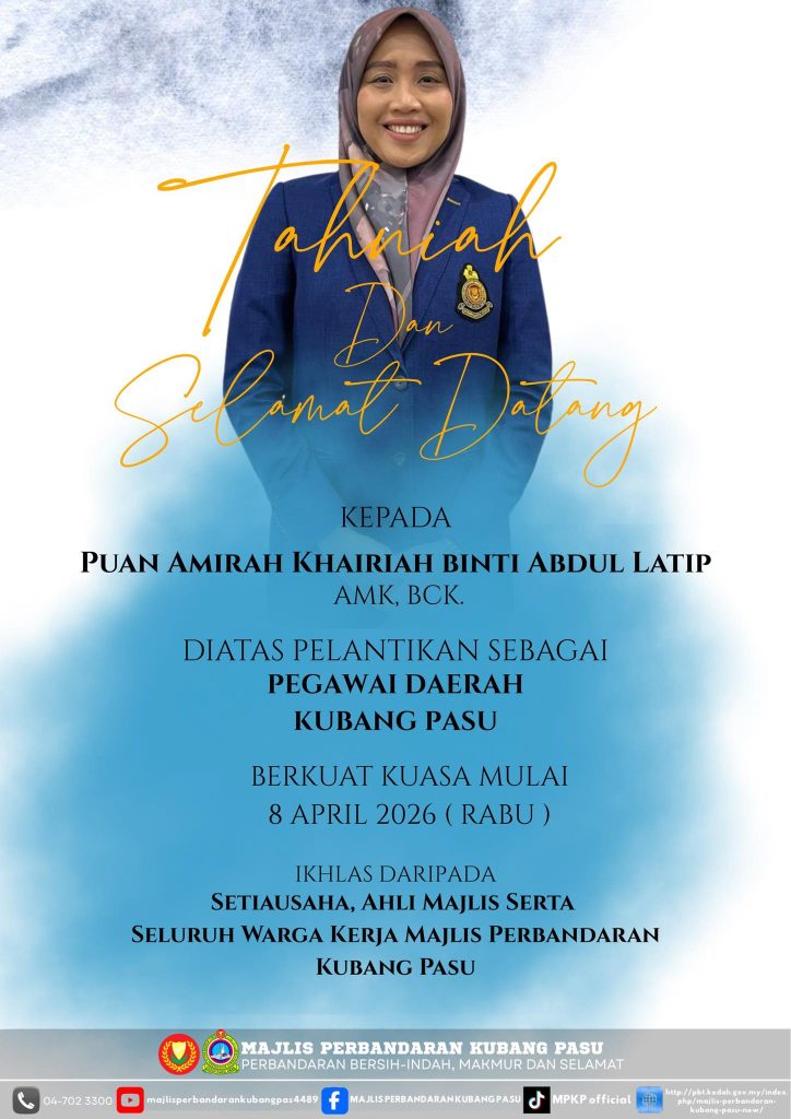 Seluruh warga kerja Majlis Perbandaran Kubang Pasu (MPKP) ingin merakamkan setinggi-tinggi ucapan tahniah kepada Puan Amirah Khairiah binti Abdul Latip (AMK, BCK.) di atas pelantikan beliau sebagai Pegawai Daerah Kubang Pasu yang baharu, berkuat kuasa 8 April 2026.