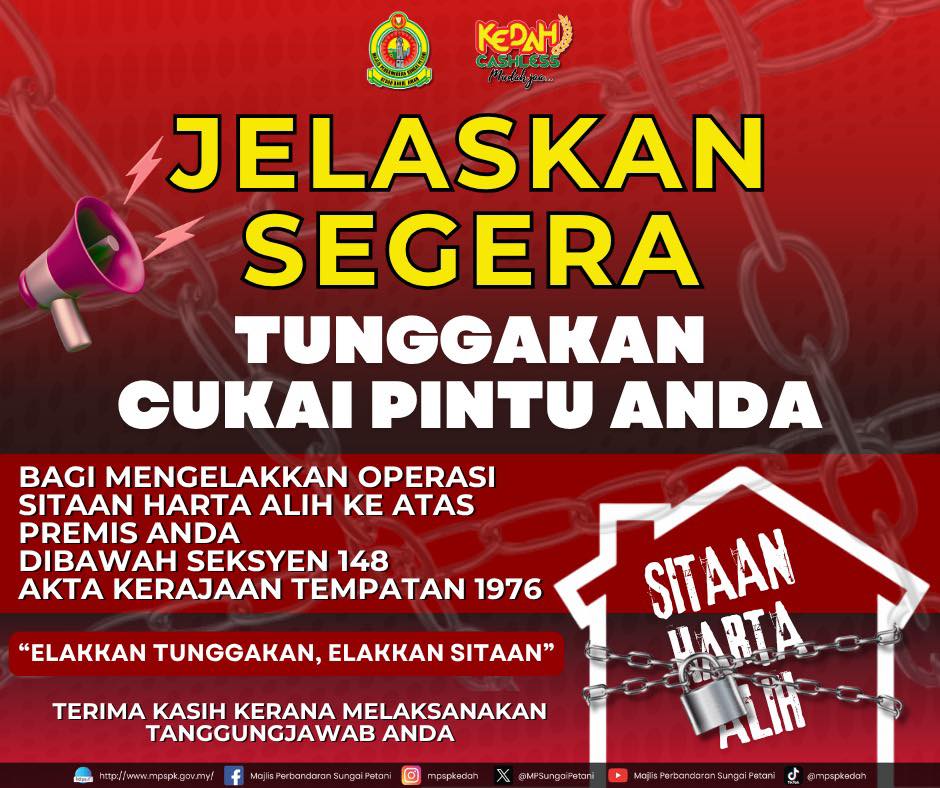 Dimaklumkan bahawa pihak Majlis akan melaksanakan operasi sitaan harta alih ke atas premis yang masih gagal menjelaskan tunggakan, selaras dengan peruntukan di bawah Seksyen 148, Akta Kerajaan Tempatan 1976.