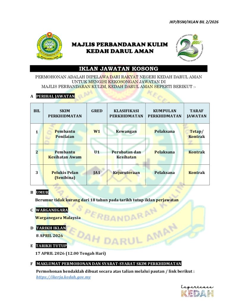 Segera hantar permohonan anda dan sertai kami dalam usaha memajukan Majlis Perbandaran Kulim.