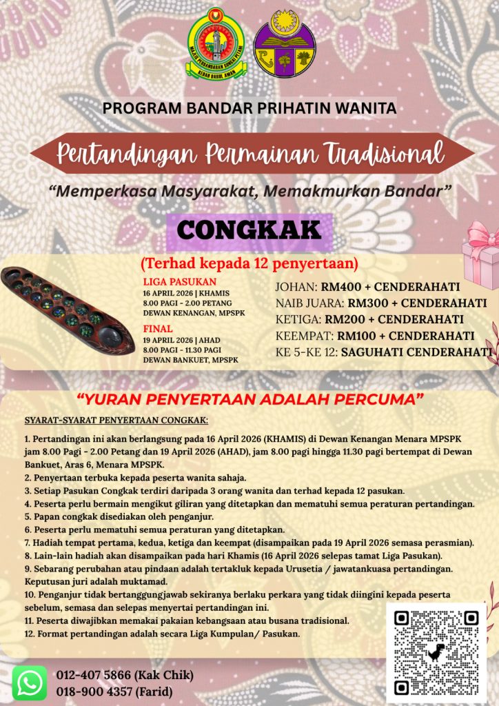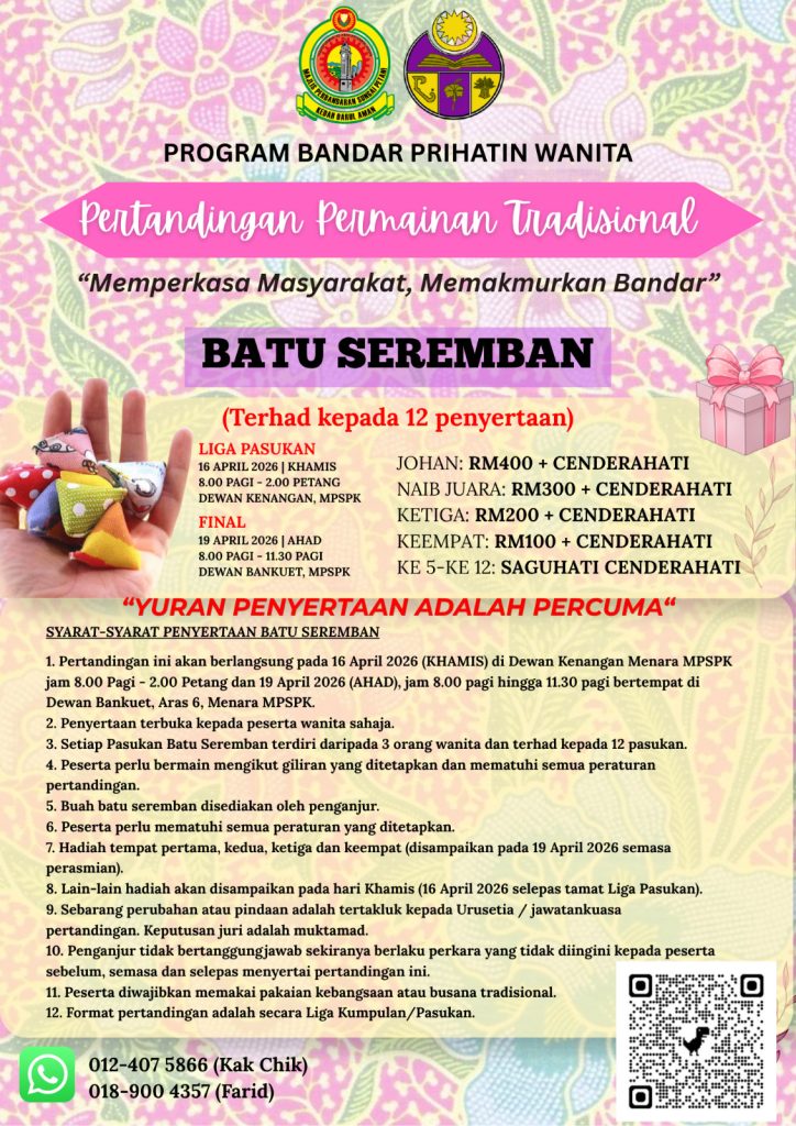 - Batu Seremban & Congkak: 012-407 5866 (Kak Chik) / 018-900 4357 (Farid)