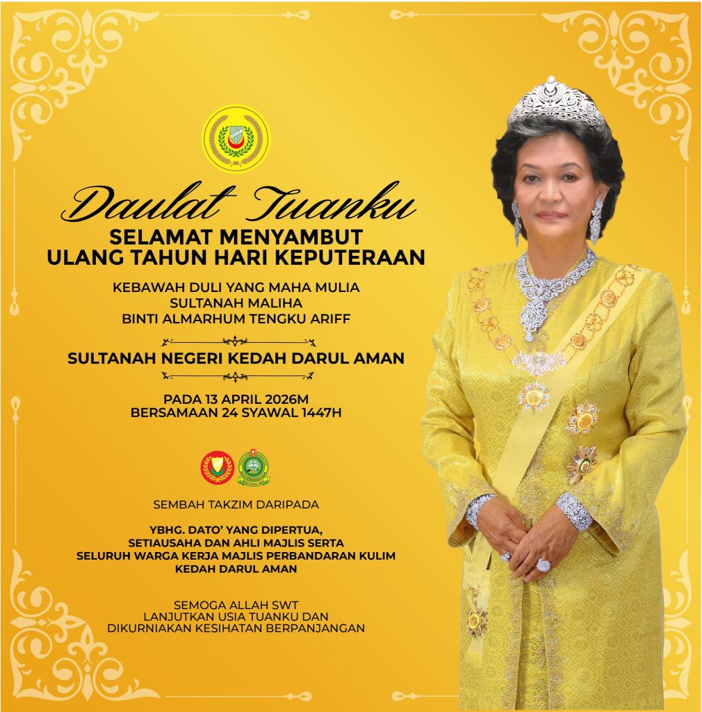 Kebawah Duli Yang Maha Mulia Sultanah Maliha binti Almarhum Tengku Ariff, Sultanah Negeri Kedah Darul Aman, pada 13 April 2026 bersamaan 24 Syawal 1447H.