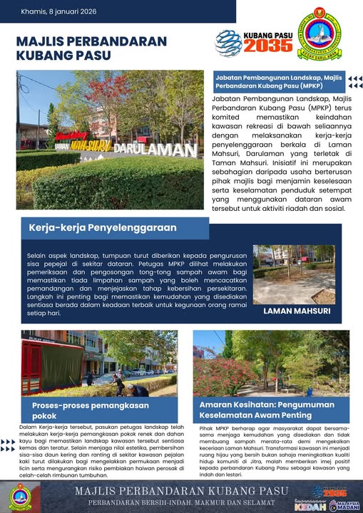 Majlis Perbandaran Kubang Pasu (MPKP) Melalui Jabatan Pembangunan Landskap Terus Komited Memperkasakan Penyelenggaraan Taman Awam